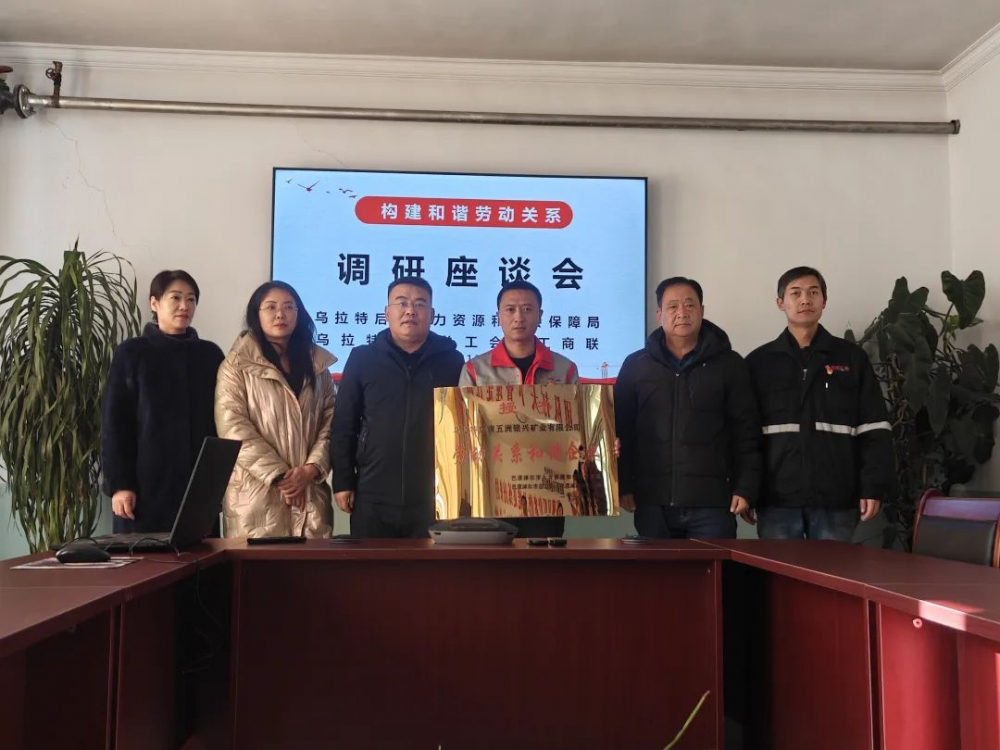 12月25日,烏拉特后旗人社局黨委書記、局長敖日格樂,總工會副主席潘瑩,工商聯副主席馬述敏等一行人到訪,在公司二樓會議室開展座談會并進行“勞動關系和諧企業”授牌儀式,公司黨支部副書記、經理史小亮,職能部室人員參加座談會。